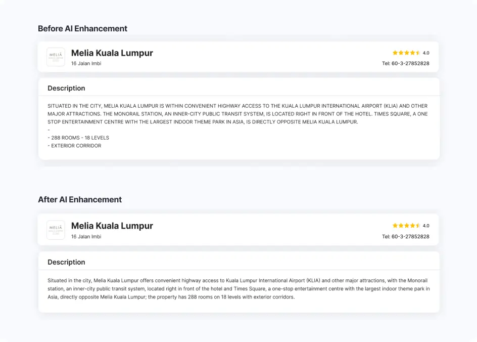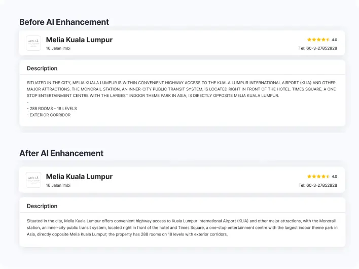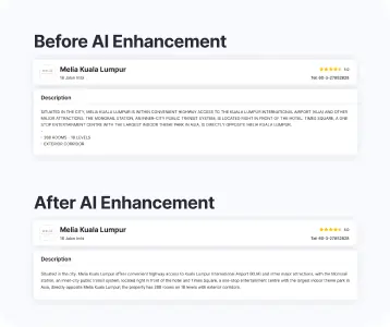 Our AI enhances this content by transforming it into clear, structured, and user-friendly descriptions—helping travelers make faster and more confident booking decisions.